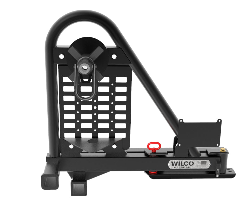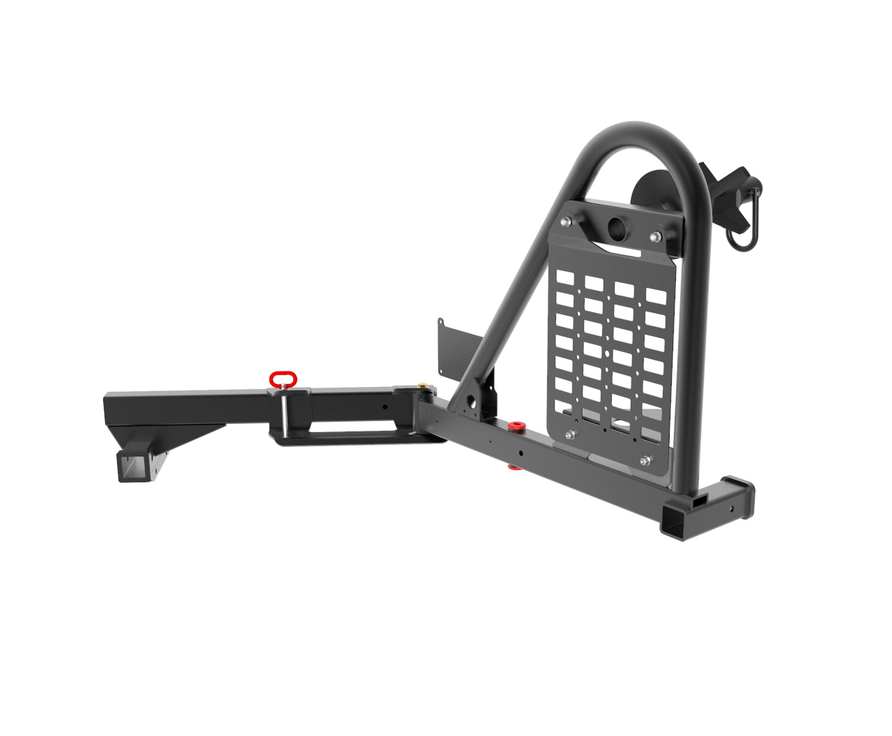 Introducing the all New Hitchgate X, with a completely new design and more standard features than anything in the industry. The Hitchgate X mounts to any class III 2" hitch receiver, with 3 distance positions and can carry up to a 37" tire. The Hitchgate X is raised 4.5" for better clearance in the rear when on the back roads or steep departure angles. Easily mount or remove the tire on a threaded rod with wheel cone and wheel hub, No bolts or lugs needed. Comes with a secondary Cargo Hitch, spring loaded locking pin in the open position, wheel support plate, license plate relocation bracket, Molle rack for additional gear and built in Hi-Lift jack mount.